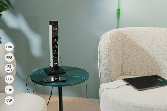 Pleine fonctionnalité pour les espaces de créativité et pour les postes de travail flexibles ou fixes. L’ordinateur portable de bureau se recharge rapidement grâce à la puissance de 100 W. Au même moment, la batterie du smartphone ou de la tablette est alimentée en énergie au niveau du deuxième connecteur. Efficace grâce à la technologie au nitrure de gallium, préserve la batterie grâce à une alimentation programmable (Programmable Power Supply).