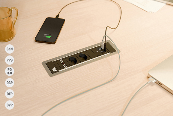 En dessous ou au-dessus de la table, le chargeur compact de 65 W est flexible et apporte l’énergie où il en faut. Deux connecteurs garantissent un courant de charge suffisant pour charger deux appareils en parallèle. Charge rapide de notebooks et de petits ordinateurs portables ainsi que deux tablettes ou smartphones. Idéal pour les postes de travail en desk sharing, pour les salles de réunion ou ateliers.