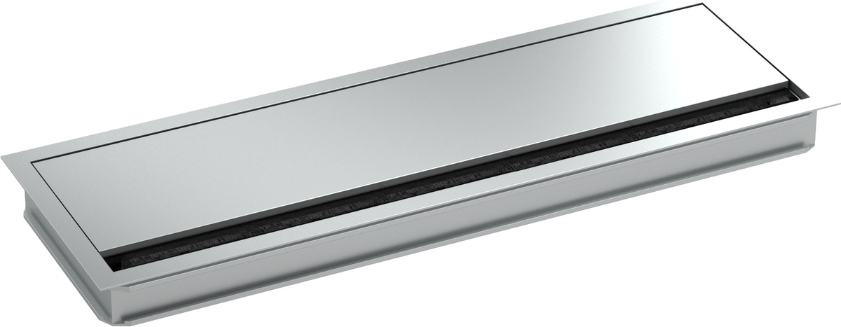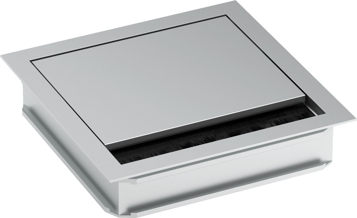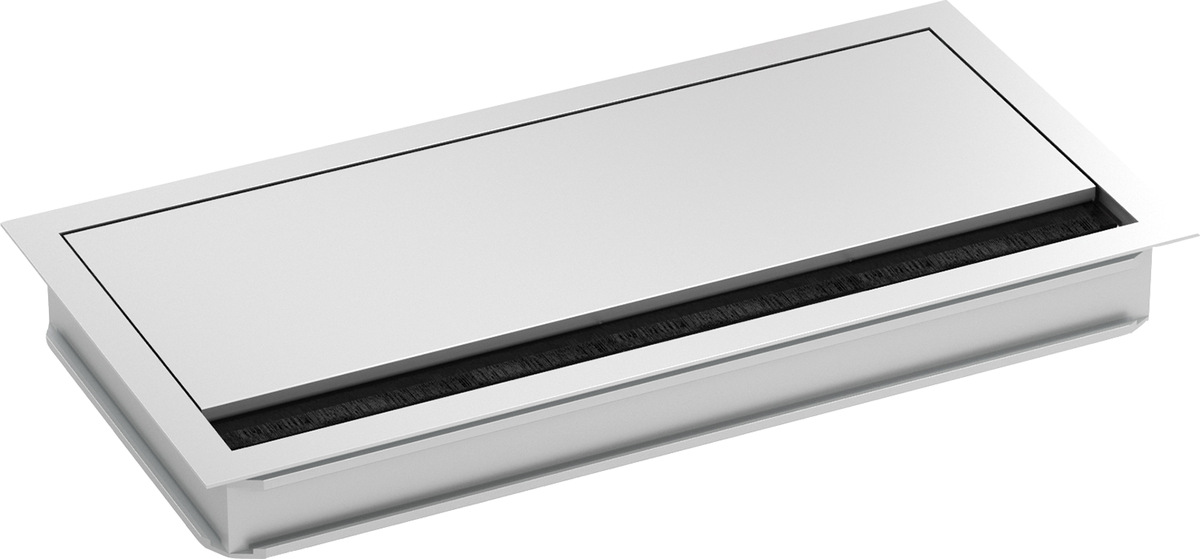 El pasamuros angular BACHMANN hace que ahora todavía sea más fácil acceder a los enchufes, etc. debajo del tablero de la mesa. El producto, disponible en una construcción elegante anodizado en plata, puede insertarse rápida y fácilmente en su sección de la mesa en el bastidor de montaje y ofrece acceso a las bandejas de cables estándar ya fijadas debajo de la encimera. Los cables pueden guiarse muy fácilmente a través de la apertura: lo que también es posible cuando está cerrado debido al conjunto de escobillas en negro.